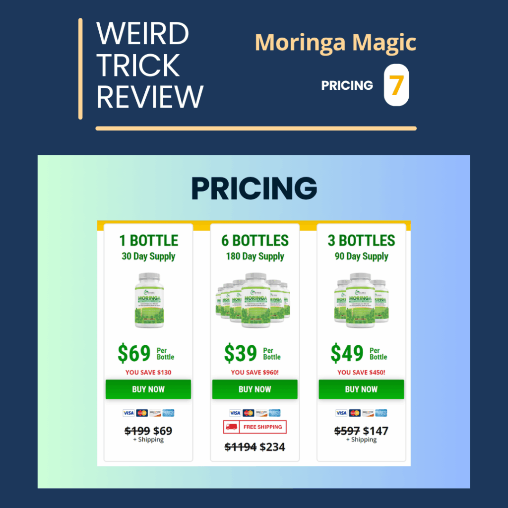 Moringa Magic is priced at $49 to $79 per bottle, depending on the number of bottles you order.