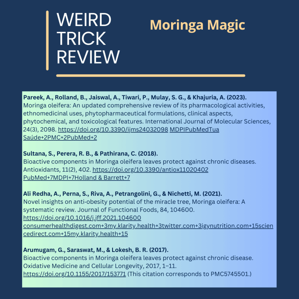 Novel insights on anti‑obesity potential of the miracle tree, Moringa oleifera: A systematic review. Journal of Functional Foods, 84, 104600. https://doi.org/10.1016/j.jff.2021.104600 consumerhealthdigest.com+3my.klarity.health+3twitter.com+3igynutrition.com+15sciencedirect.com+15my.klarity.health+15