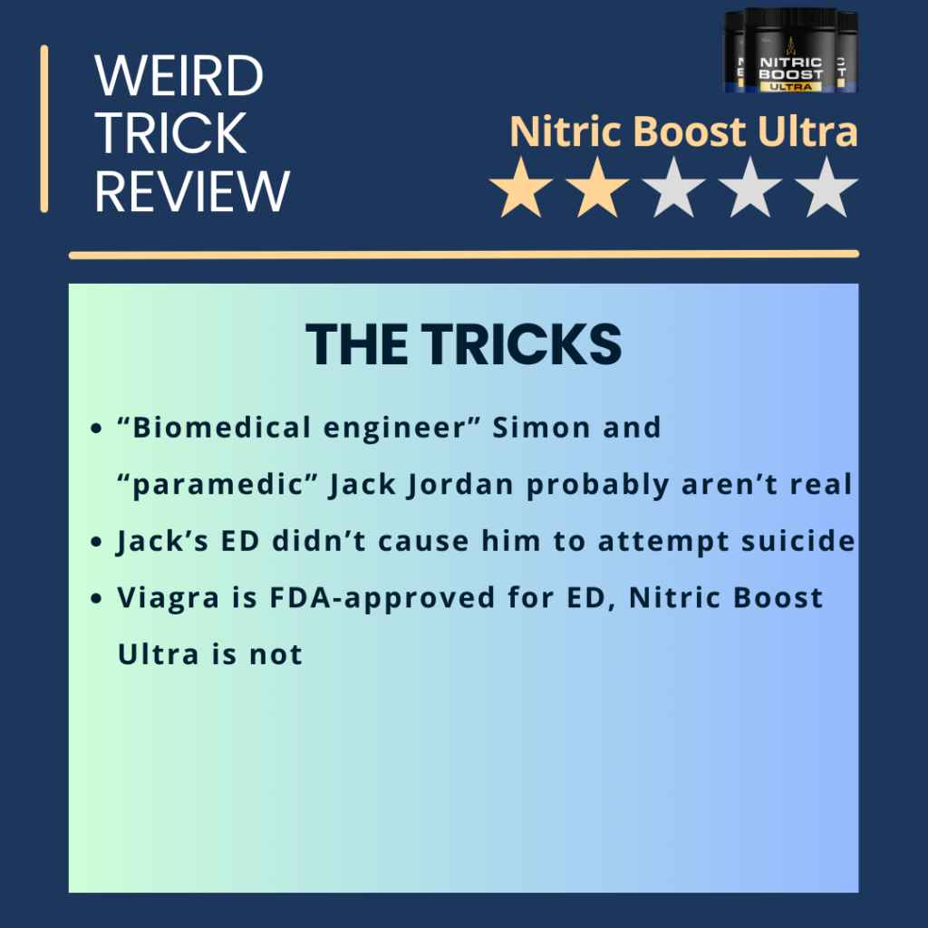 Nitric Boost Ultra, like other ED supplements marketed online, also seems to badmouth Viagra a little too much. Viagra is an FDA-approved drug for ED. The FDA approved Viagra for ED after extensive studies proving its safety and efficacy. Nitric Boost Ultra, like all other supplements, isn’t approved by the FDA (because the FDA doesn’t approve individual supplements).